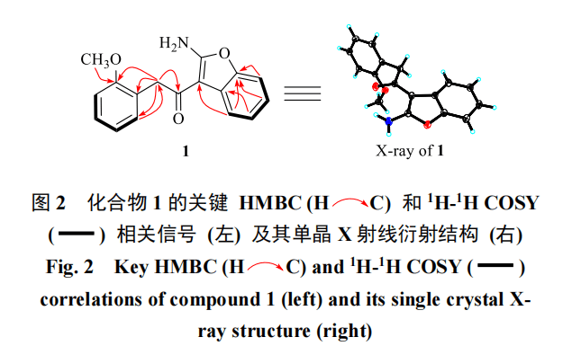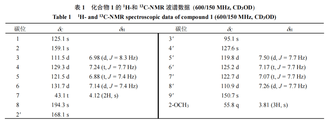 UV-2401A型紫外分光光度计(日本京都岛津公司)。Bruker DRX-600型核磁共振仪(Bruker公司)。API QSTAR-TOF型高分辨飞行时间质谱仪;Multiskan FC型多功能酶标仪。柱色谱用硅胶(200~300目,中国青岛海洋化工有限公司)、反相硅胶RP-18(40~60 μm,德国达姆施塔特默克公司)。Waters 600型高效液相色谱仪,配备Zorbax SB-C18色谱柱(250 mm×9.4 mm,5 μm)。预制薄层板(厚度200~250 μm,青岛海洋化工有限公司)。