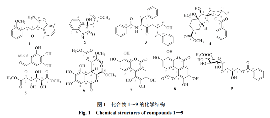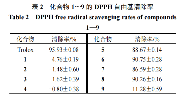 在50μmol/L浓度下,对化合物1~9的DPPH自由基清除能力进行了测试。如表2所示,化合物5~8表现出DPPH清除能力,清除率为86.59%~90.75%。化合物1~4、9在50μmol/L浓度下DPPH清除率均<20%,表明其在该体系中无明显抗氧化活性。